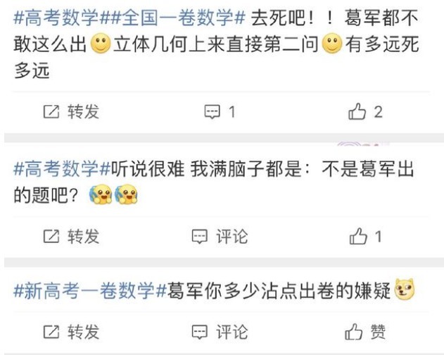 考生们都怀疑是不是葛军老师今年又参与高考命题了,还有学生说“韦神我让你附体没让你附卷子”。